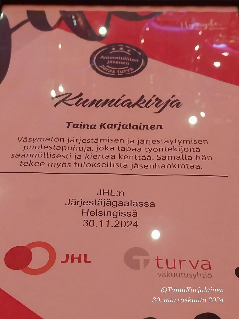 Järjestäjä-Gaala ikimuistoinen tapahtuma ja tunnelma, te ajatuksissani mukana. Kyynel valui silmä kulmaani kun gaalassa nimeni mainittiin ja lähdin salin läpi kulkemaan, hakemaan kunniakirjaa "Väsymätön järjestämisen puolesta puhuja". KIITOS kuuluu myös sinulle Kaveria Ei Jätetä. Pidetään yhteyttä, jatketaan hyviä keskusteluja, muistellaan muistoja jotka kannattelee. Ystävällisin terveisin Ay-aktiivi Taina se duunari itsekkin 040 6303549 jhl067varaplm@outlook.com Huom! Saa soitella myös viikonloppuisin, jätä soittopyyntö otan yhteyttä, jos en vastaa.